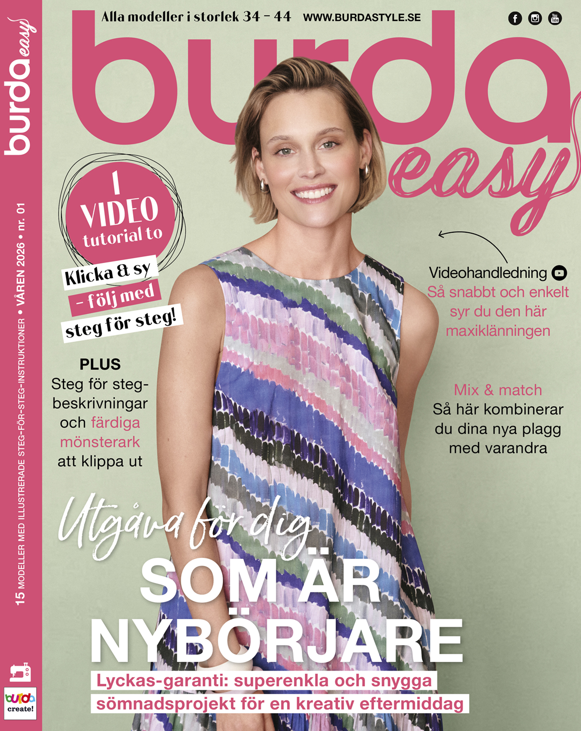 Burda Easy är magasinet för nybörjare inom sömnad, med enkla mönster och snabba projekt samt tydliga steg-för-steg-instruktioner med illustrationer.